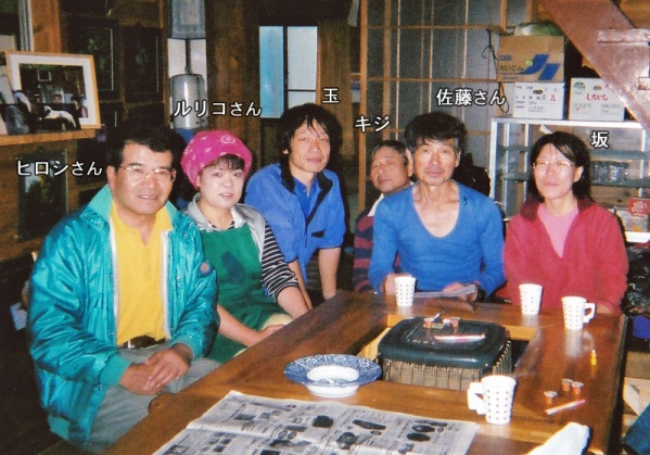 創立記念山行、2000/10/21~22。四季楽園にて持参した「立山」を飲みながら、新しい会の抱負を熱く語り合う4人。(たまたま後ろに写っているのは大森さん)
